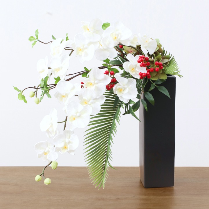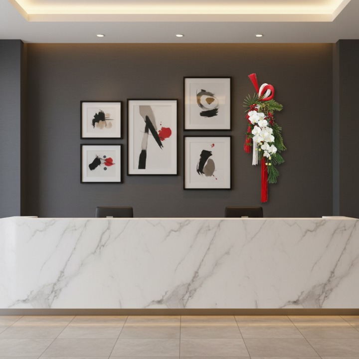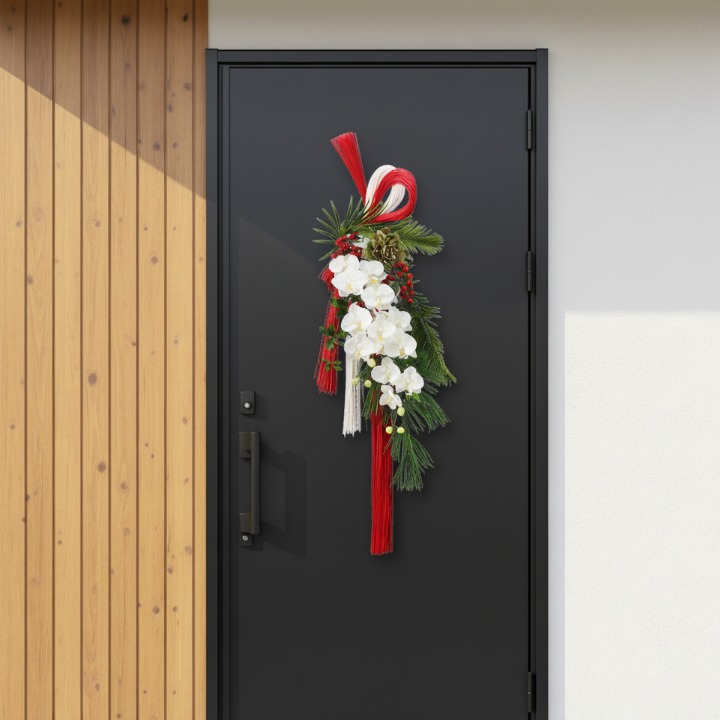 迎春を彩る、祝意あふれる胡蝶蘭しめ飾り。モダン紅白水引アレンジ