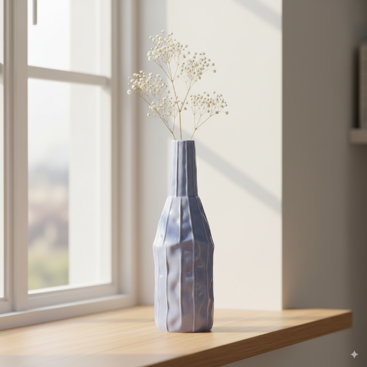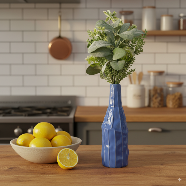 高さ約26cmのスリムな形状は、場所を取らずにどんなスペースにもすっと馴染みます。窓辺に飾れば、光を受けてブルーがより一層爽やかに。木の温もりがあるナチュラルなインテリアの中に置けば、お互いの色を引き立て合う素敵なアクセントになります。
