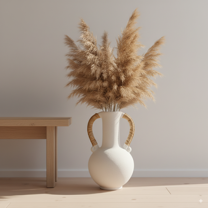 高さ35cmというしっかりとしたサイズ感は、リビングの床や、お部屋のコーナーに直接置いても素敵です。パンパスグラスやドウダンツツジのような、背の高い枝ものを無造作に活けるだけで、一気にお洒落な空間が完成します。