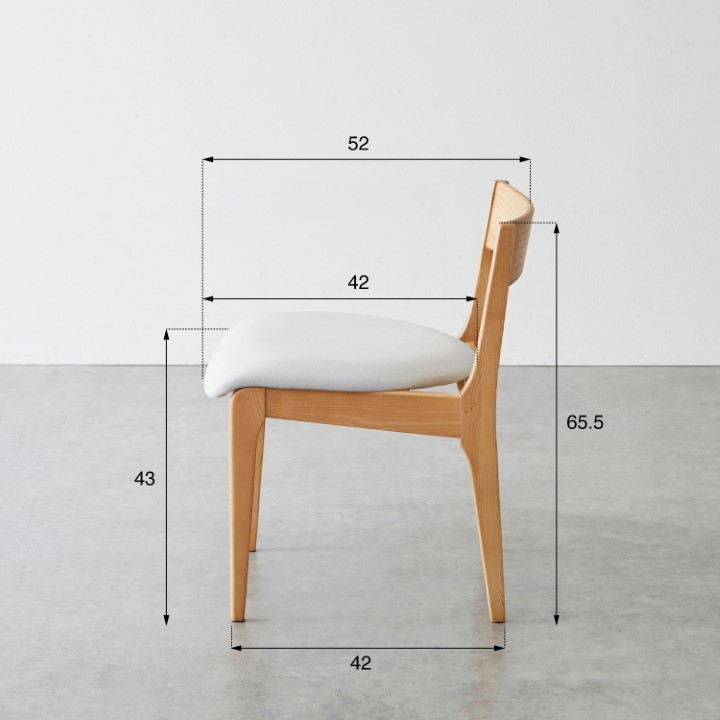 天然木アッシュ材とファブリックの柔らかな風合いが調和するアームレスチェア。