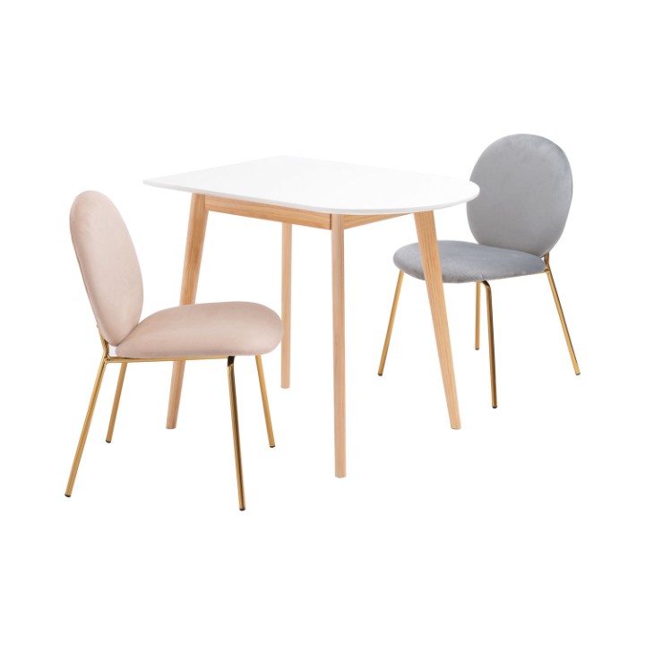 一辺に曲線を取り入れたやさしいフォルムで、凹凸のない滑らかなホワイト天板と、天然木の脚の組み合わせが可愛らしさを演出してくれます。
