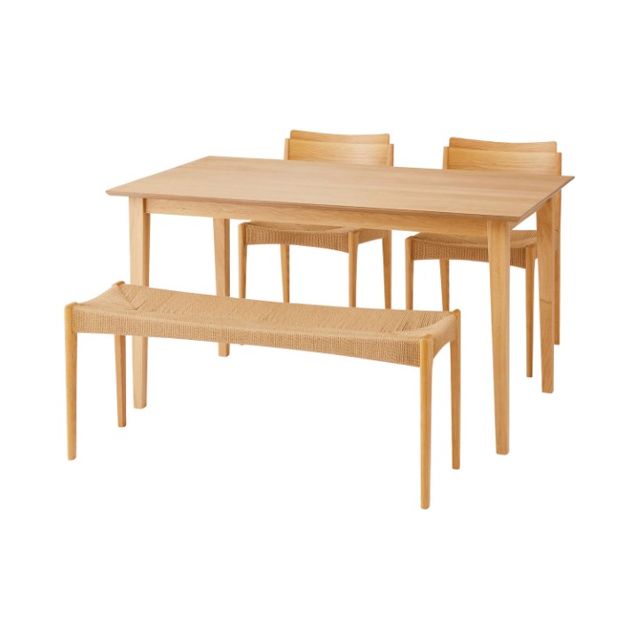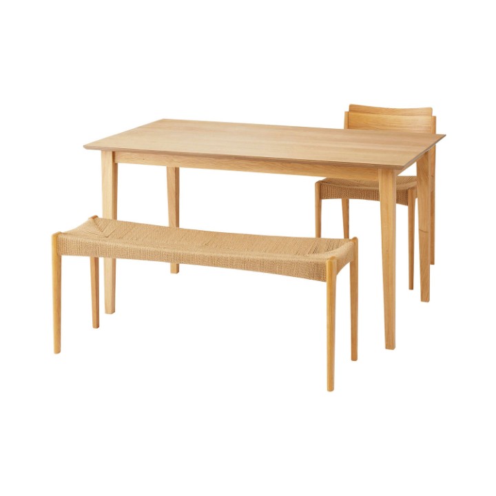 ●ホワイトオークの木目を活かした、シンプルなデザインのダイニングテーブル。●木目が美しいホワイトオークを使用。清楚感があり上品な色味と木目が特徴で、ナチュラル系インテリアの代表的な材として、オーク材の魅力を活かしたシンプルなデザイン。●脚は天板側から床側にかけて徐々に細くなっていくテーパードレッグ。ダイニングスペースが重くなりすぎず、様々なチェアに合わせられるデザイン。●天板のエッジは斜めにカットしデザイン性の高い仕上がり。●サイズ展開は省スペースでも使いやすい135センチと、4人で座ってもゆったりと使用できる150センチの2種類からお選びいただけます。●木目の表情を活かした天板が食卓に彩りを与えてくれます。