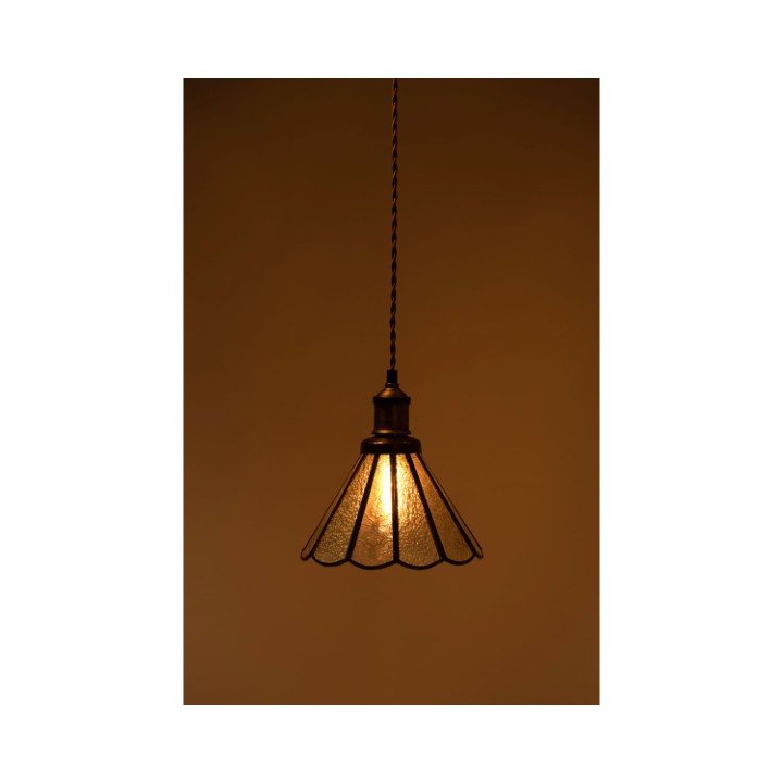 レトロ感漂うペンダントライト。ステンドグラスのシェードは立体的な模様が特徴的。どこか懐かしいノスタルジックな雰囲気を感じさせます。一灯はもちろん。広範囲には多灯付けがおすすめです。●形も特徴的なステンドグラス。シンプルだけど可愛らしいステンドグラスは消灯時にも立体的なデザインがインテリアとして演出してくれます。●点灯時の表情の変化。シェードの内側は光を反射して美しいデザインを楽しめます。消灯時とはまた違った表情をお楽しみください。●ご家庭のシーリングプラグに付けられます●コードの長さを調整できます