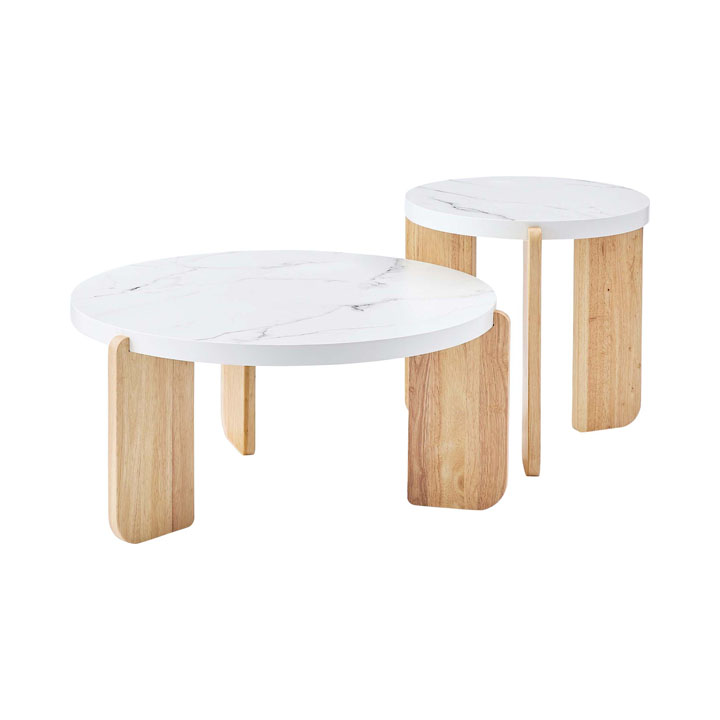 ●大理石調天板と天然木を組み合わせたラウンドテーブル。