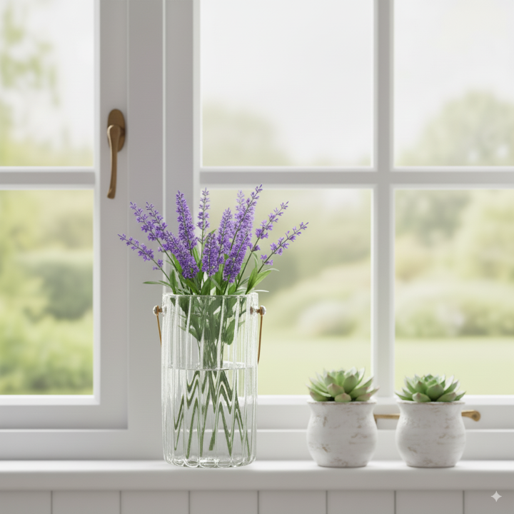 ラベンダーのドライフラワーや、カスミソウのような可憐な草花を飾るのにぴったりのサイズ感。もちろん、フェイクグリーンを入れて窓辺に吊るせば、まるでサンキャッチャーのように光を集めてくれます。