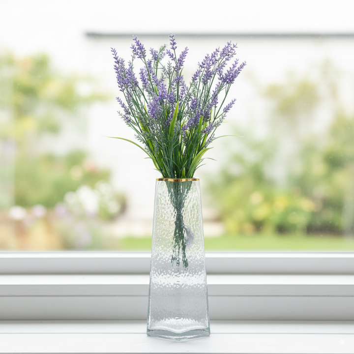すっきりと伸びる三角形のフォルムは、モダンで知的な印象を与えます。光を受けてきらめくクリアなガラスと、口元を縁取る細いゴールドのラインが、華奢でありながらも高級感を演出。どんなインテリアにも合わせやすい、タイムレスなデザインが魅力です。